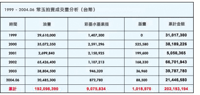 常玉的晚期畫作中,經常使用油漆、纖維板(masonite)等材料,甚至出現使用同樣畫板反覆作畫的情形,台北歷史博物館所收藏的一批作品即可證明。因為常玉油畫作品的稀有,國內畫商引進常玉油畫時,就是採高價方式,但依舊供不應求。我們從附表1999年至2004年6月的「常玉拍賣成交件數」(Sanyu lots sold at auction)的數據來看,每年成交的件數逐漸遞減,但平均單價節節高升。因為物以稀為貴,有錢不一定買得到常玉的畫,所以筆者稱之為「夢寐以求名單」。