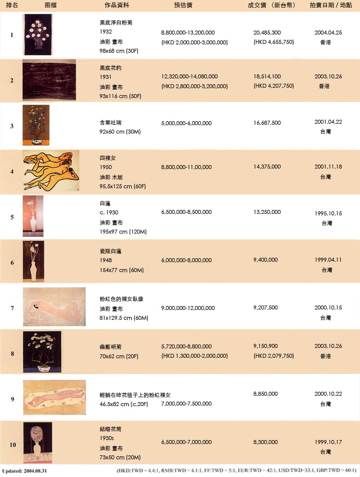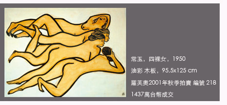 1950年代的油畫《四裸女》(Four Nudes)(約60號)出現在1998年4月19日的台北蘇富比拍賣會,預估價僅有300至400萬,以台幣621萬元(平均一號約10萬)拍出。這幅畫在2001年11月18日的台北羅芙奧(Ravenel)拍賣會的估價台幣880至1100萬元,最後以台幣1437萬5000元(平均一號約24萬)成交,三年半的時間價值增加131%。