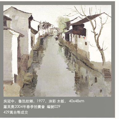 吳冠中的 《高昌遺址》繼1989年5月締造中國在世書畫家拍賣紀錄之後,同年9月他的油畫也開始現身香港拍賣會。1972年的5號小油畫《庭園小景》、1975年的15號油畫《黃山》,分別以20萬港元 (約台幣66萬元)及26萬港元(約台幣85萬8000元)落槌,一號油畫單價台幣5.7萬、13萬元左右。相較於當時香港彩墨畫所締造的身價,吳冠中油畫叩關的價格算是保守多了。不過,第二年《巴黎蒙馬特景色》就創下中國在世油畫家的最高成交紀錄,不讓彩墨畫專美於前。此後,吳冠中的油畫繼續再現身拍場,平均每幅油畫有百萬台幣以上的身價。