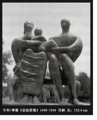 摩爾被視為是二十世紀英國最偉大的雕塑家,一生主要以人像雕塑為主題。儘管他一生看到無數新雕塑材質的變革,還是從文化傳統與藝術大師之間吸取養分,介於具象和抽象之間。穿孔雕塑是他的特色之一,強調各個角度的空間之美。除了「斜躺的人體」(reclining figure)為摩爾常見的造型之外,「家庭群像」(family groups)也是摩爾引人入勝的創作。1943年,他曾經接受北安普敦(Nothampton)聖馬太教堂(Church of St Matthew)的委託,雕刻《聖母子》(Madonna and Child)作品,這一件作品可說是「家庭群像」的前身。「家庭群像」系列,無疑從西方聖家族的傳統得到啟發。這裡的《家族群像》是雙親抱一兒的造型,最早源於1945年,之後不斷地變化,一直創作到1948、1949年,約創作出17種變體版本。這裡推薦的《家庭群像》作品即屬於最早的版本之一,人物頭部的造型帶有超現實主義的成份。他的雕塑是對古代藝術的反省,尤其喜歡雕塑女人,或許是他受到古文化母性社會的影響,經常從生活的山川河谷裡找尋造型靈感,形式簡約與空間佈局,反映出崇尚自然的意境。而1956年的《坐姿女孩》(Seated Girl),則是一件充分展現雕塑家的技能的代表,摩爾在經歷殘酷的二次大戰之後,回歸於文明的精心呈現。